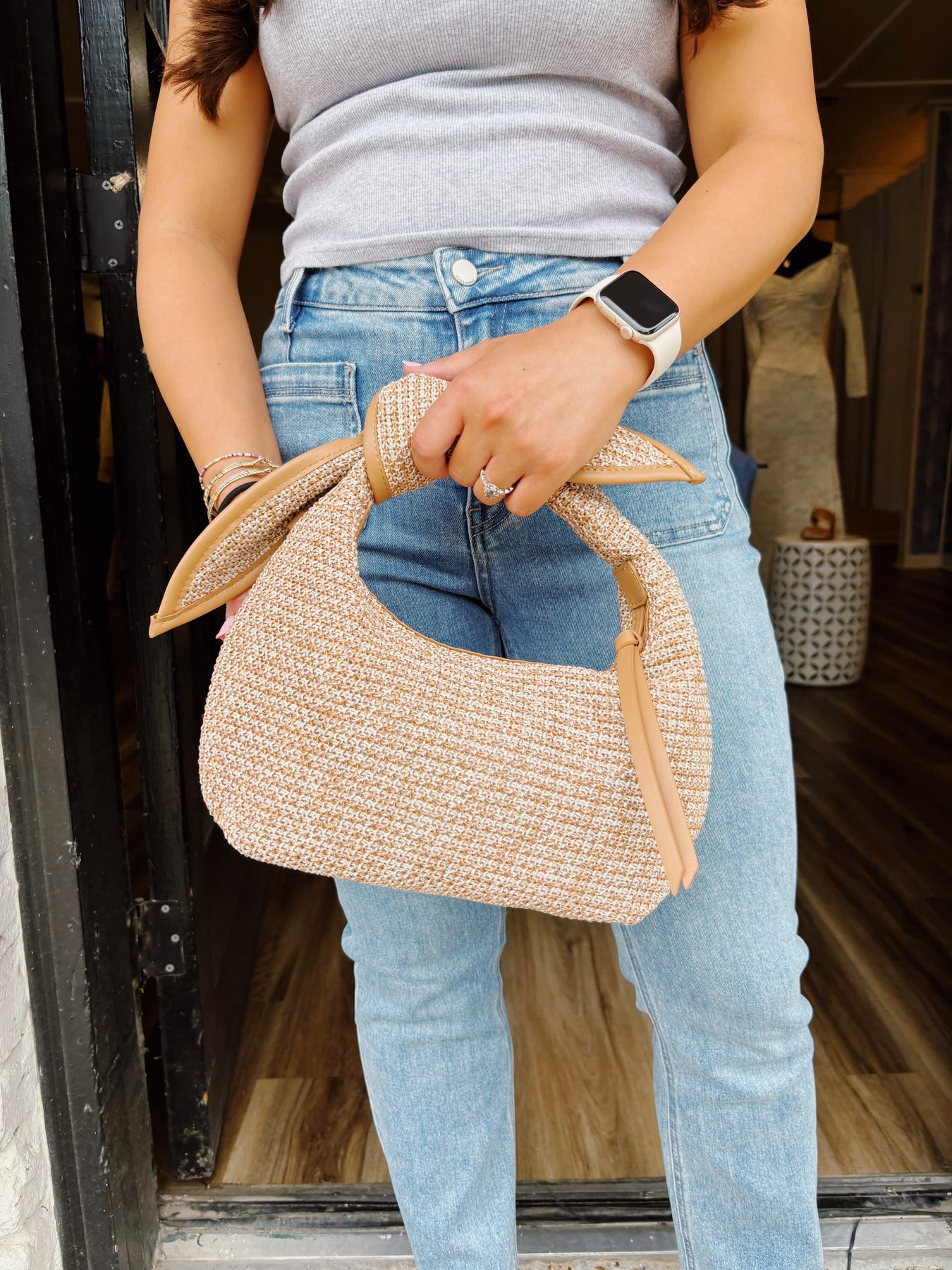 Regular price $86.99 Save $-86.99Introducing Jessa, the perfect clutch for any occasion. Made with durable straw material and a secure zipper closure, its woven all-over design is accented with sparkling rhinestones and a knotted handle detail. Keep your belongings organized with the fabric lined interior and convenient zip and slip pockets. Elevate your style with Jessa today!